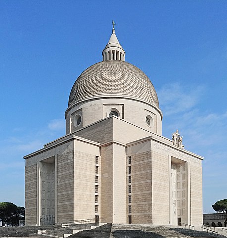 Cette basilique remarquable, de style central avec une croix grecque, présente une impressionnante coupole de 32 mètres de diamètre, l'une des plus imposantes de la ville. Son revêtement extérieur en travertin lui confère une élégance intemporelle. Son architecture est complétée par des portiques latéraux, des statues imposantes des saints patrons Pierre et Paul, et un escalier monumental reliant la place de l'église à l'avenue Europa.