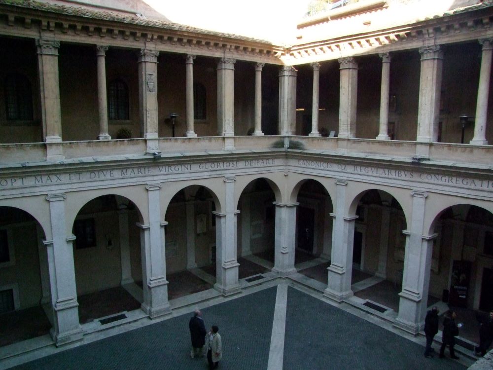 Édifice modèle de la Renaissance construit par l'architecte Bramante entre 1500 et 1504. Il a une esthétique harmonieuse combinant le meilleur des traditions architecturales grecques et romaines avec les nouvelles techniques du XVe siècle. Du café installé au premier étage, on peut admirer les fresques de Raphaël de la chapelle Chigi à l'intérieur de Sainte-Marie-de-la-Paix, adjacente au cloître.