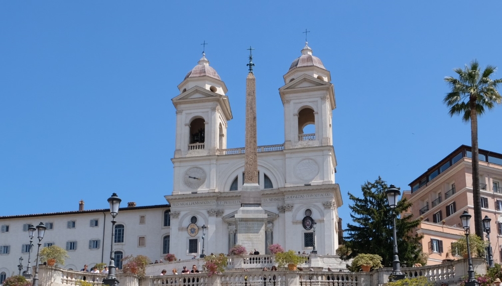 Construite au XVIe siècle, elle est notable pour ses 135 marches qui la relient à la place d'Espagne en contrebas. Dans ses chapelles intérieures, on trouve de nombreuses œuvres d'art dont un cycle de fresques de la vie de la Vierge (1559) par Daniele da Volterra, un élève de Michel-Ange. Le couvent, construit en même temps, abrite de nombreuses œuvres anonymes, probablement réalisées par des moines y ayant habité. Dont un cycle de fresques bibliques datant du XVIIe, des tableaux de saints et une Anamorphose, fresque en illusion d'optique qui vaut le détour. En savoir +